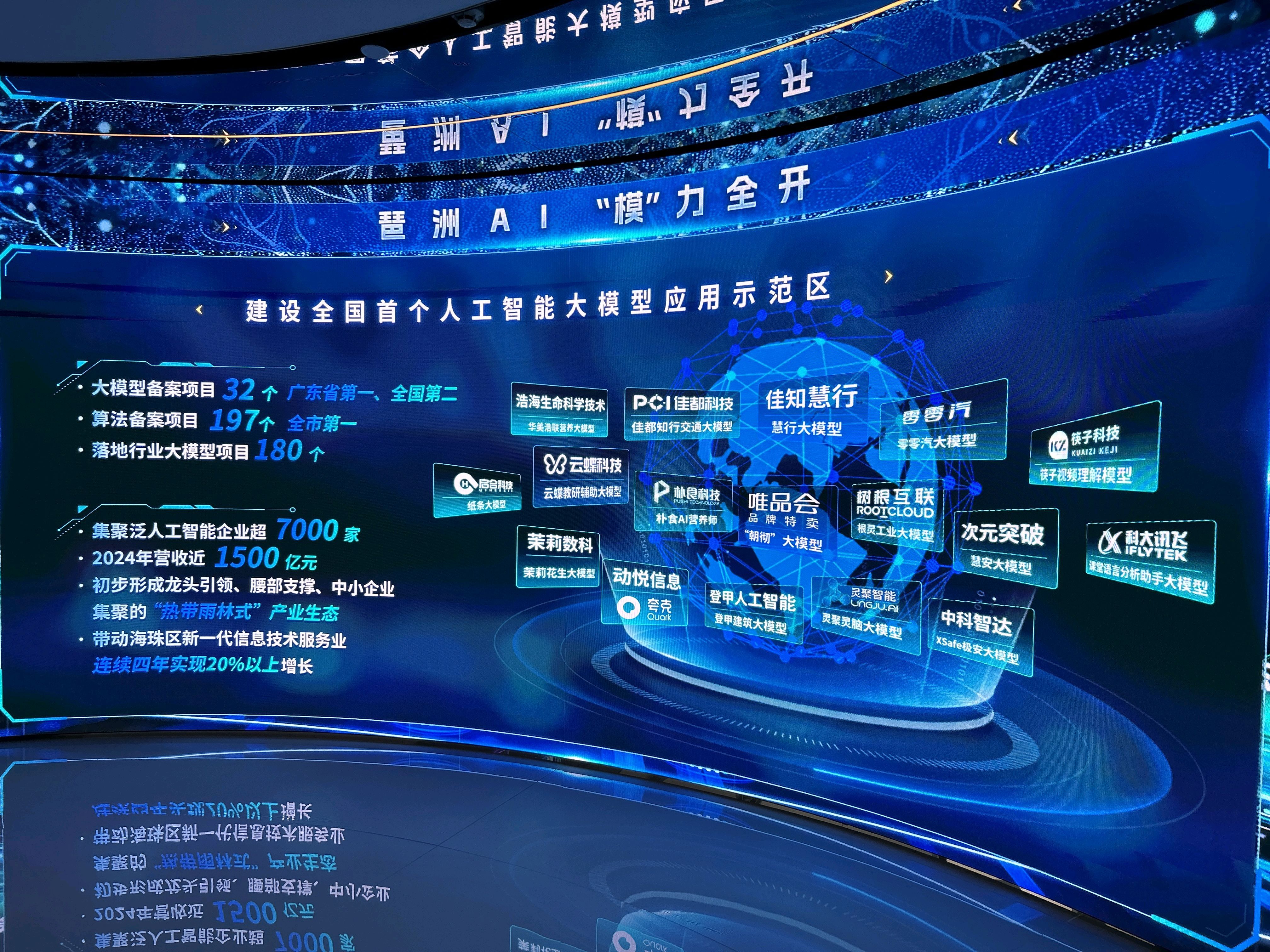 这些成果背后,离不开海珠对人工智能大模型产业的持续投入。从“算法、算力、数据”三个关键基座入手,推动AI从技术研发向行业应用跃迁。截至目前,全区已落地行业大模型项目180余个;引育备案大模型32个,为广东第一、全国第三;算法备案261个,占全市四成以上,产业集聚效应日益稳固。